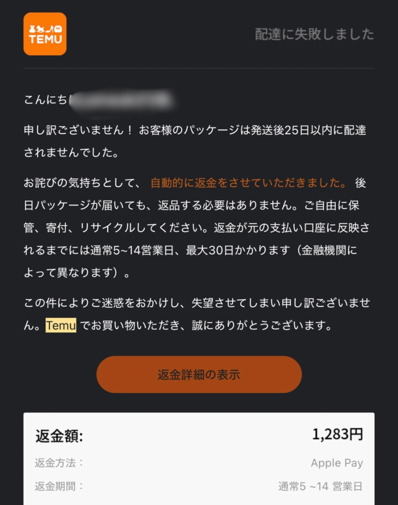 Temuは「購入した商品が届かない」「違う商品が届いた」という場合に、全額返金を行う「Temu購入者保護プログラム」を採用しています。